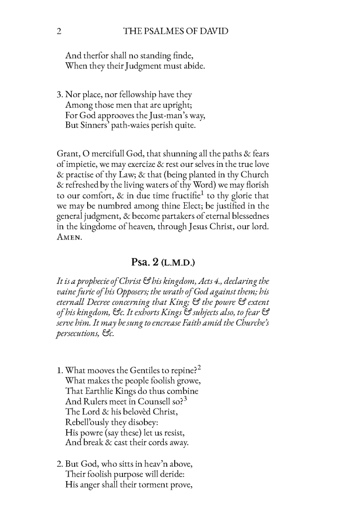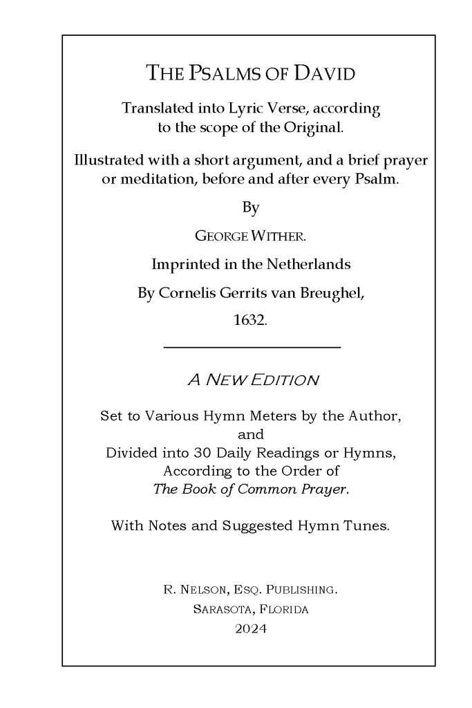 Seventy years after the first English metrical Psalter, The Whole Book of Psalms, Collected into English Metre… Set forth and allowed to be sung in all Churches, of all the People together… (1562), was published, George Wither hoped to improve its poetry by writing a new Psalter, also in lyric verse. Earlier he had written the first English hymn book, Hymnes and Songs of the Church. A hymn is a song in lyric verse, written in praise of God. In traditional translations, the Psalms do not rhyme, making them difficult to set to music and perform. However, metrical Psalters allow the individual and the congregation to sing the Psalms with familiar tunes.