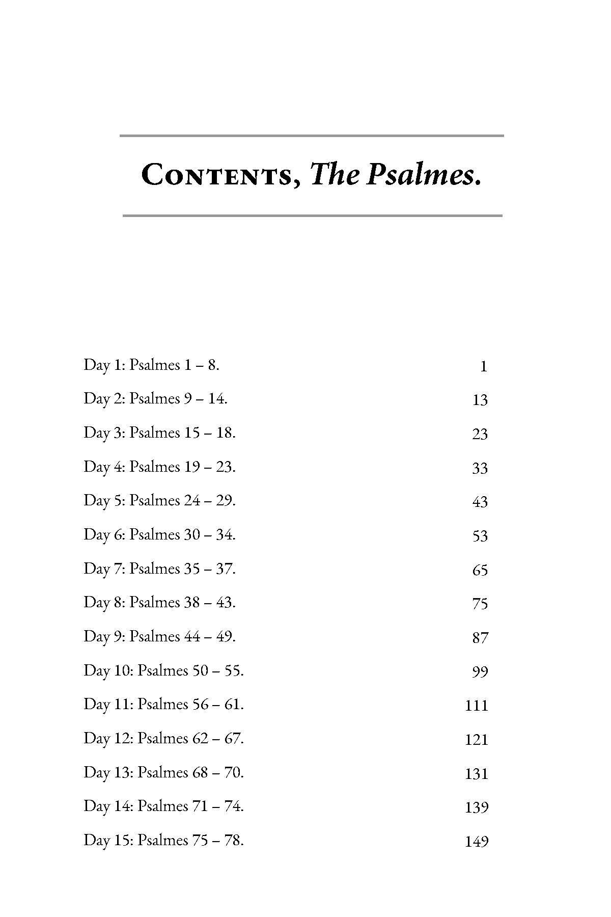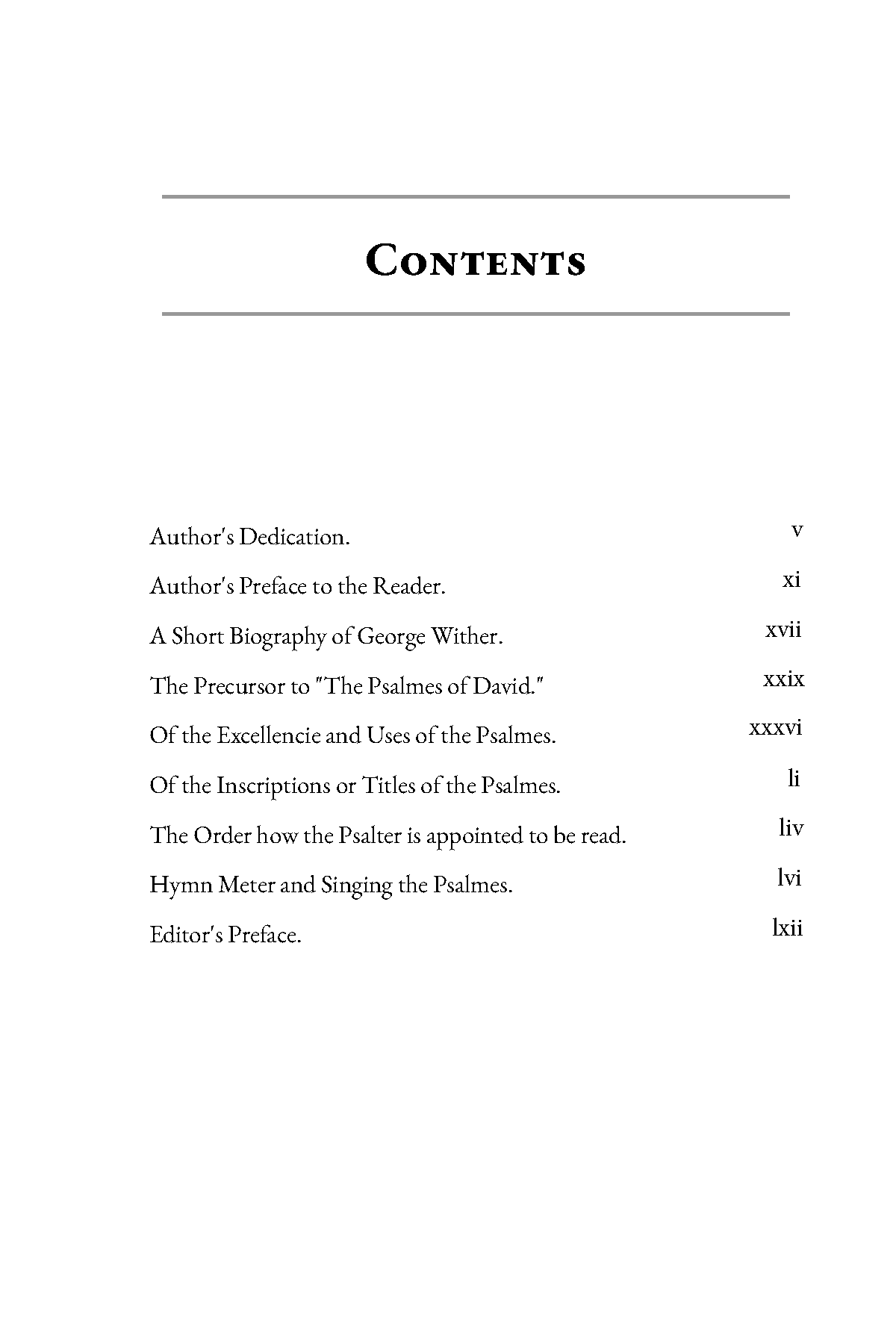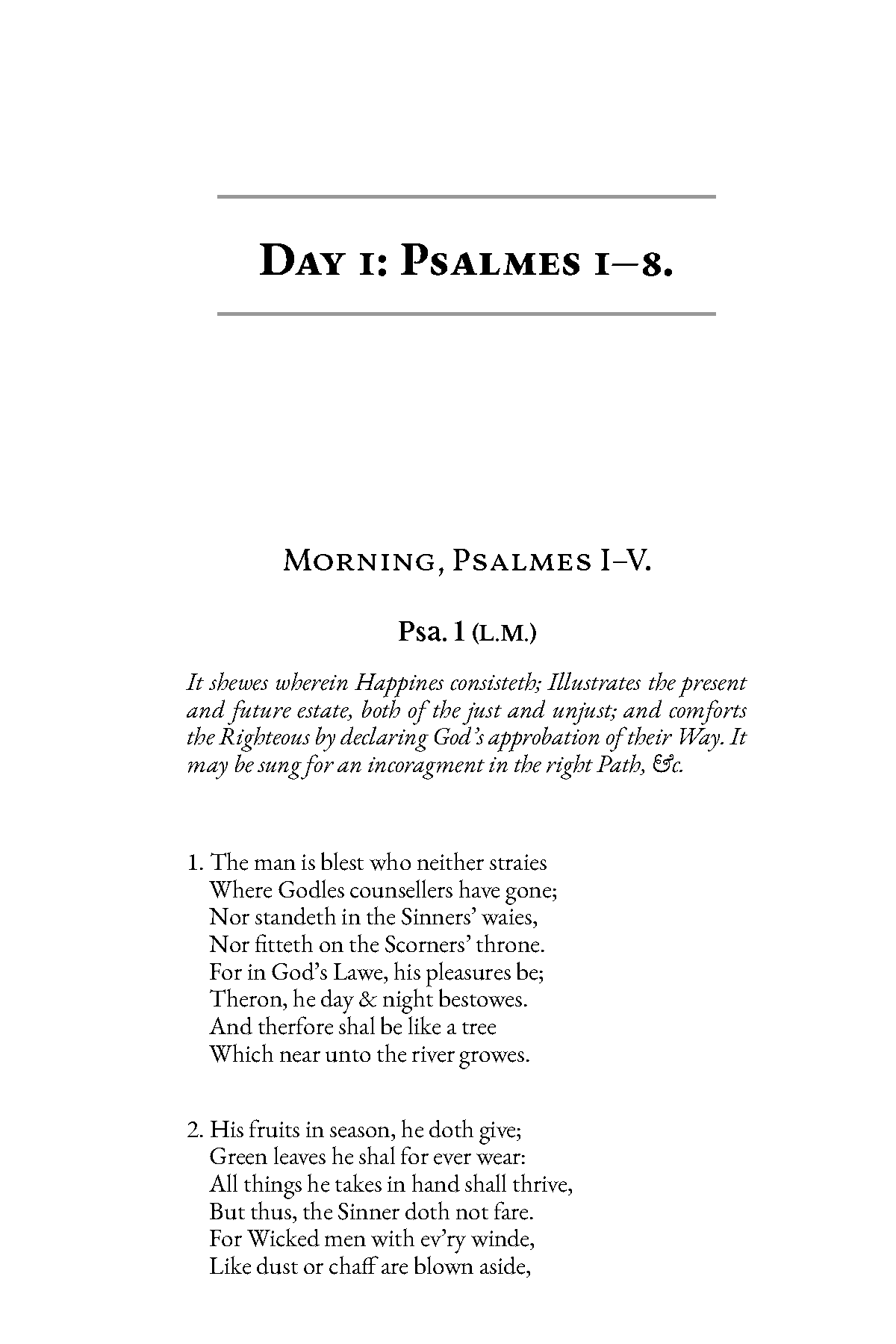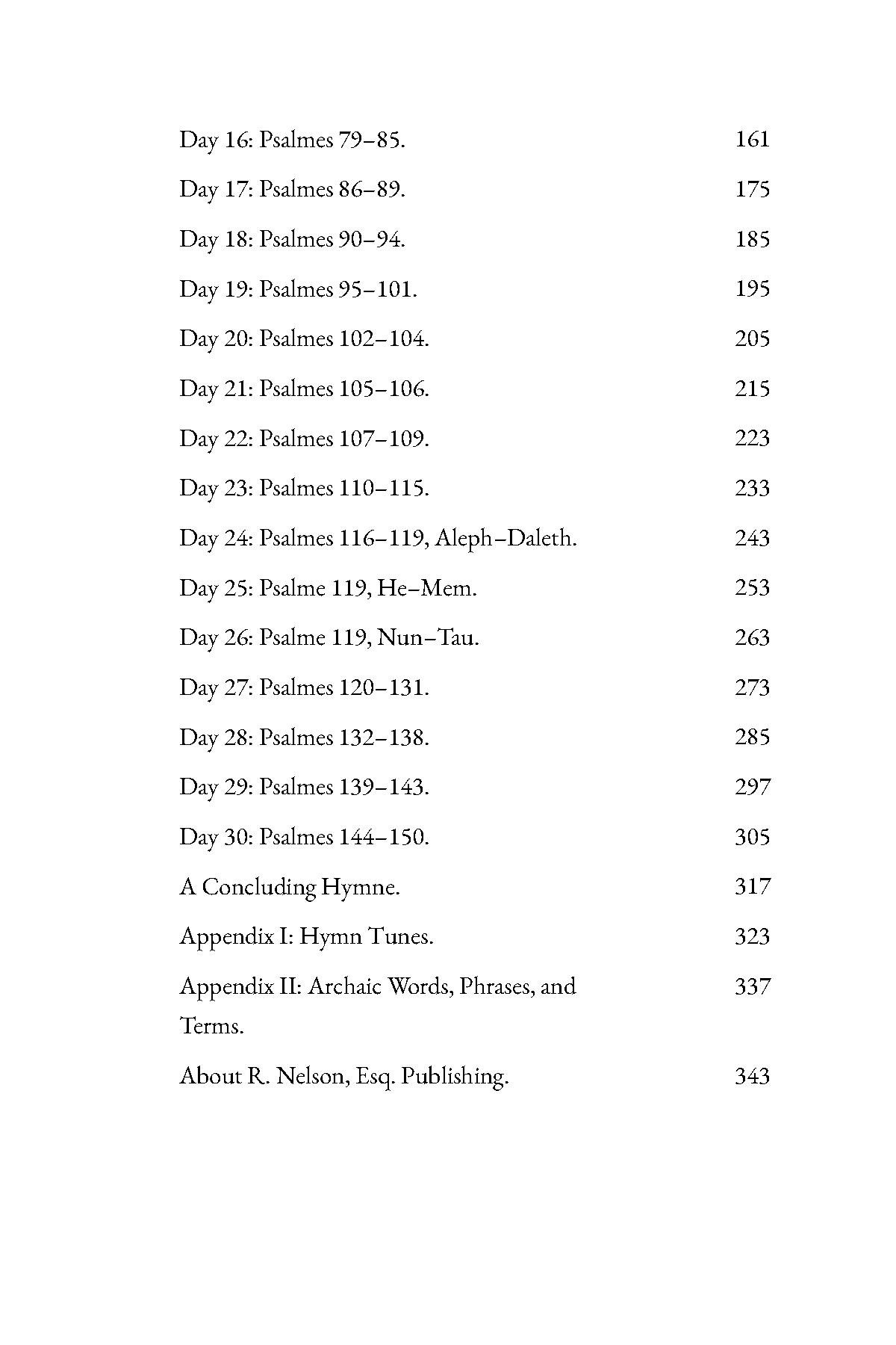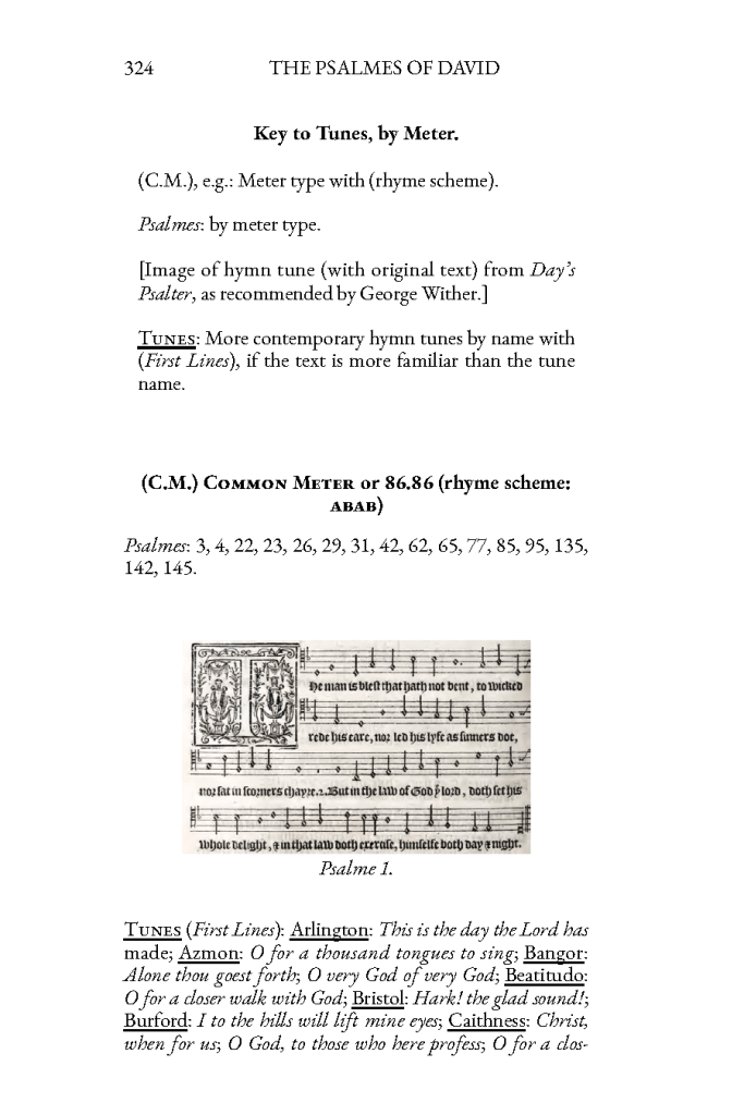 For each of the 150 Psalms, there is a paraphrase set in hymn meter, together with an introduction and a prayer based on the Psalm. Included is a list of hymn tunes, by meter, appropriate for each Psalm.